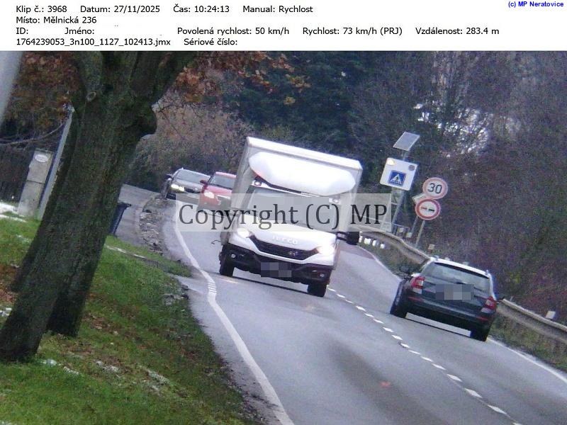 Řidič tohoto vozidla jel po ul. Mělnická v obci Obříství rychlostí 73 km/h., ačkoliv je zde povolená rychlost 50 km/h.